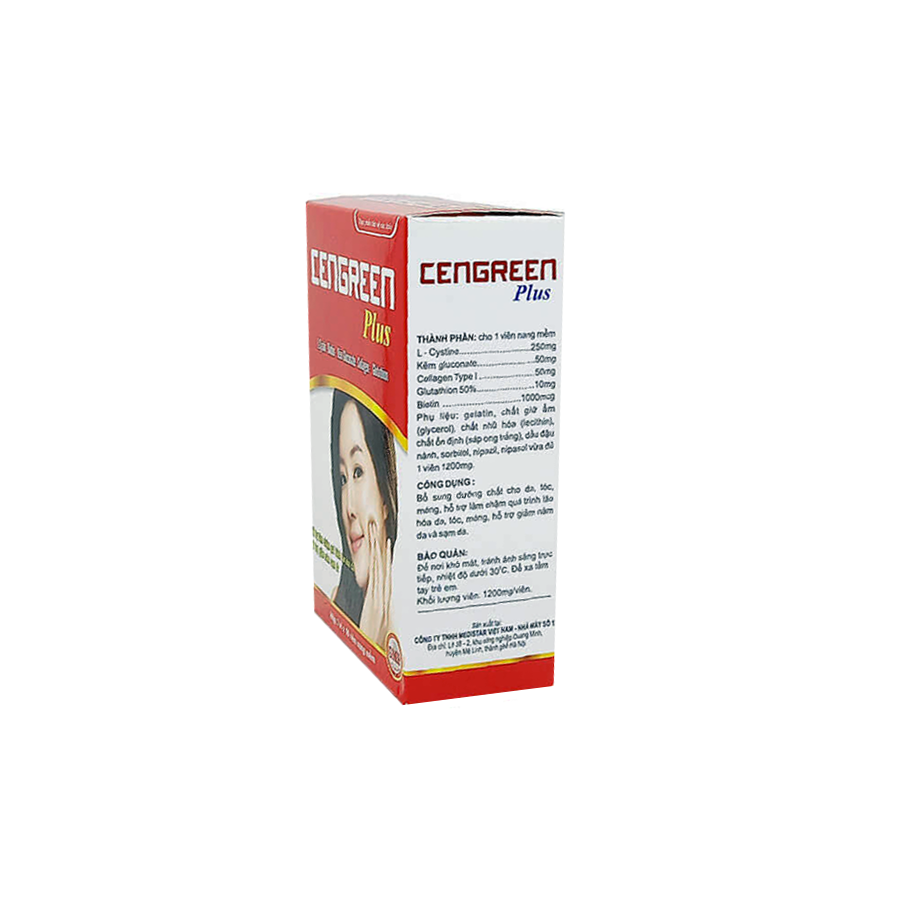 Viên uống Cengreen Plus uống hỗ trợ giảm nám sạm da, làm chậm quá trình lão hóa da và bổ sung dưỡng chất cho da, tóc, móng có tác dụng bổ sung dưỡng chất cho da, tóc, móng, hỗ trợ làm giảm quá trình lão hóa da, tóc, móng, hỗ trợ làm giảm nám da và giảm sạm da. Cengreen Plus chứa thành phần chính là các chất chống oxy hóa và vitamin nên có khả năng hỗ trợ cải thiện và phục hồi làn da, làm chậm và hạn chế quá trình hình thành sắc tố gây nám da hay tàn nhang, bảo vệ da, tránh khỏi các sắc tố da do tia UV mặt trời. Ngoài ra, Cengreen Plus còn giúp giảm thiểu tình trạng chảy máu chân răng, chảy máu lợi hay chảy máu mũi, giảm tình trạng dễ gãy móng, rụng tóc nhiều… Sản phẩm phù hợp với người thường xuyên bị rụng tóc, gãy móng, người có làn da không đều màu, sạm da, da bị lão hóa hoặc người cần bổ sung dinh dưỡng để ngăn ngừa quá trình lão hóa da.