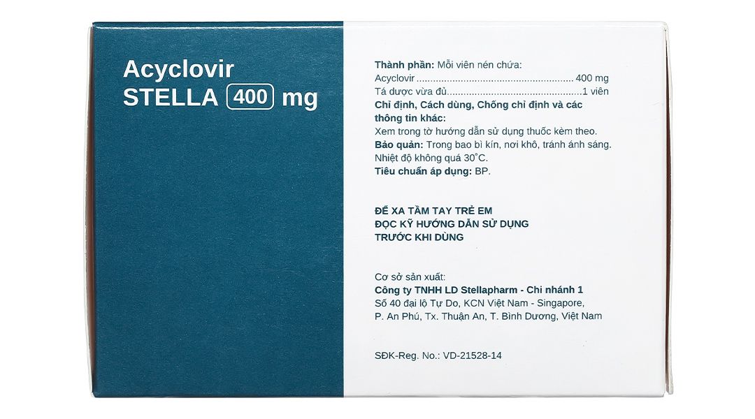 Thuốc Acyclovir Stella 400mg điều trị nhiễm virus Herpes simplex, bệnh zona, bệnh thủy đậu, dự phòng nhiễm HSV