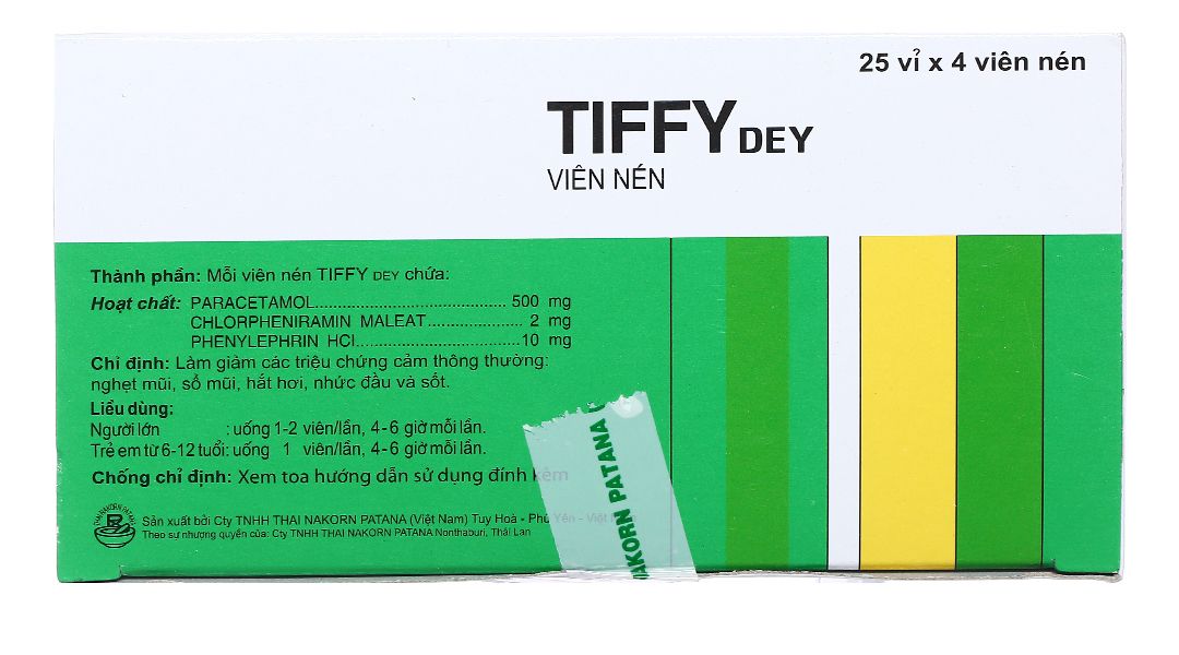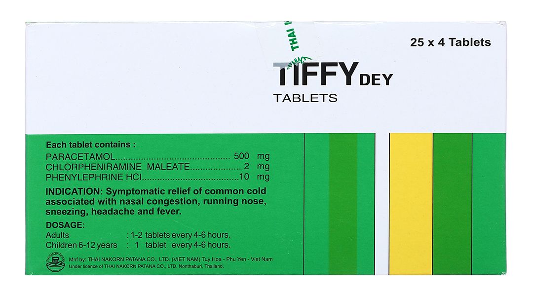 Tiffy Dey Làm giảm các triệu chứng cảm thông thường như: nghẹt mũi, sổ mũi, hắt hơi, nhức đầu và sốt.